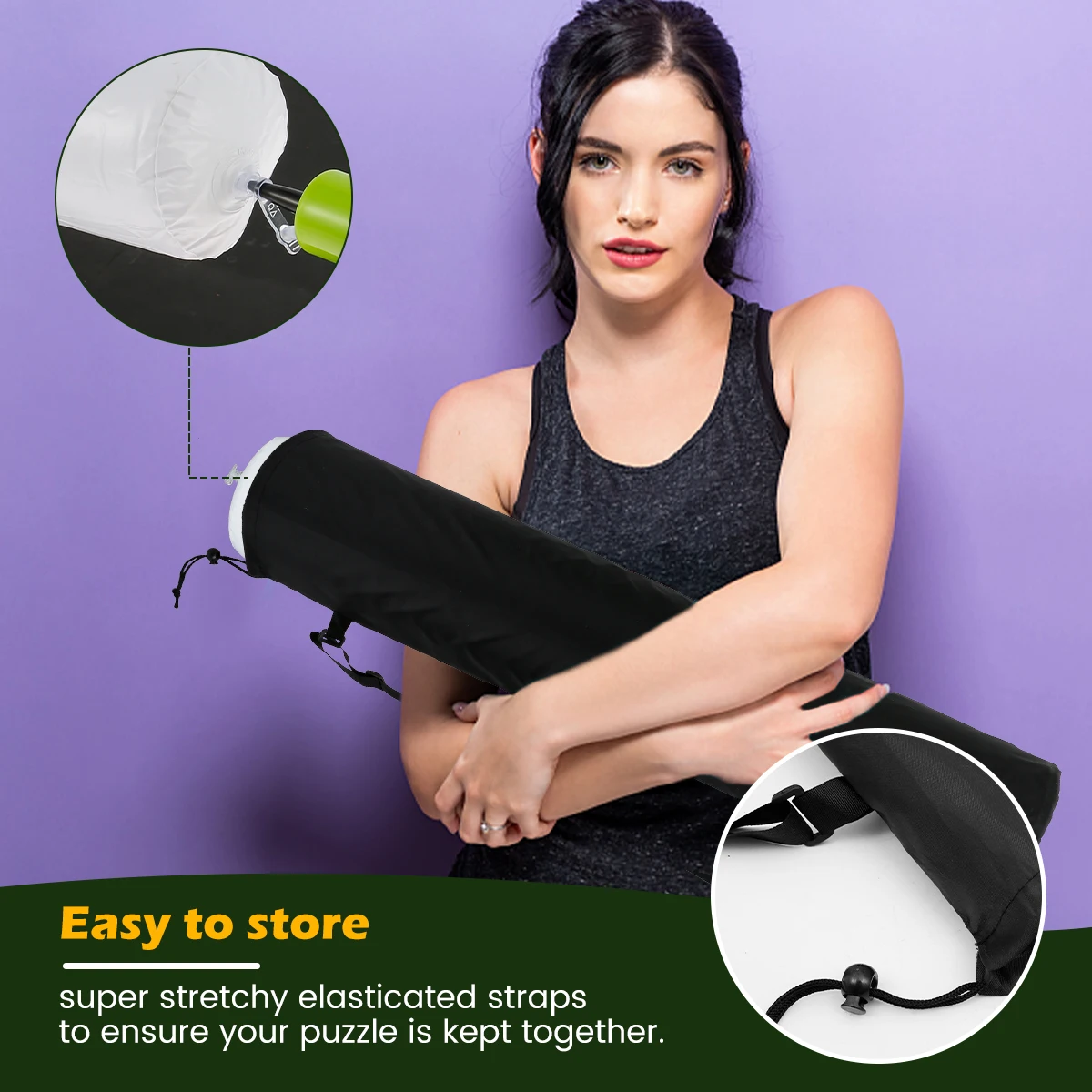[Puzzle Storage] If you want to pause and save your next unfinished game, place the inflation tube on either end of the mat, roll up the mat with even force, and secure both ends in the storage bag with elastic. You don't have to worry about storing your puzzles mess.